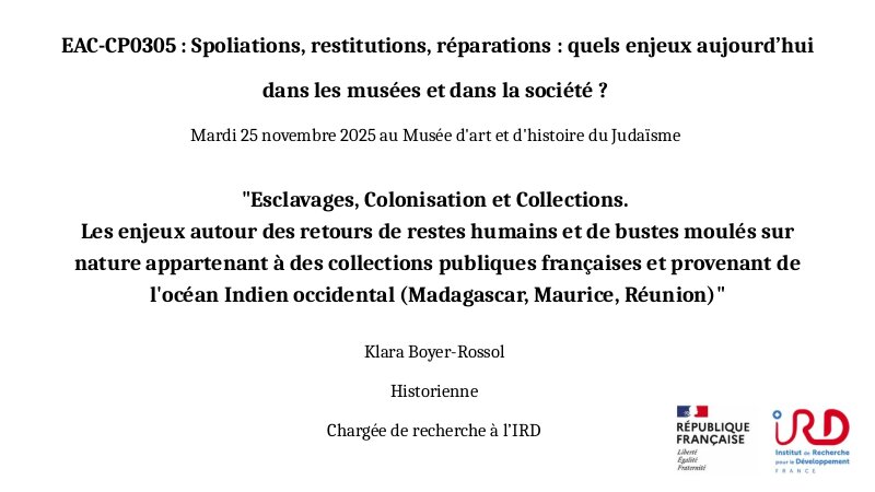 14h-15h30 : : Intervention de Klara Boyer-Rossol : "Esclavages, Colonisation et Collections. Les enjeux autour des retours de restes humains et de bustes moulés sur nature appartenant à des collections publiques françaises et provenant de l'océan Indien occidental (Madagascar, Maurice, Réunion)"